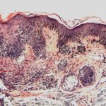 The H&E staining showed cohesive nests of small round melanocytes at the tips and bases of the rete ridges. An increased number of single melanocytes was noted along the dermoepidermal junction with some bridging noted. There was also apparent follicular extension of the junctional melanocytic proliferation as well as scattered pagetoid melanocytes appreciated in the mid to upper layers of the epidermis.