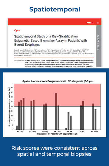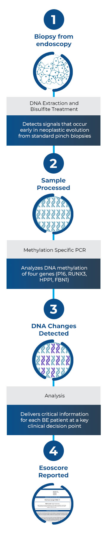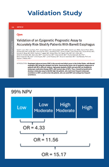 Esopredict® is a risk-stratification test offered in a small number of situations where the TissueCypher spatialomics approach is unable to provide a result. Esopredict uses a methylation-based assay that does not utilize fluorescence or tissue architecture, to determine a patient’s risk of progressing from non-dysplastic, indefinite or low grade Barrett’s esophagus (BE) to high-grade dysplasia (HGD) or esophageal adenocarcinoma (EAC). Esopredict is validated for patients with Barrett’s esophagus (BE) diagnosed as non-dysplastic, indefinite for dysplasia, or low-grade dysplasia.