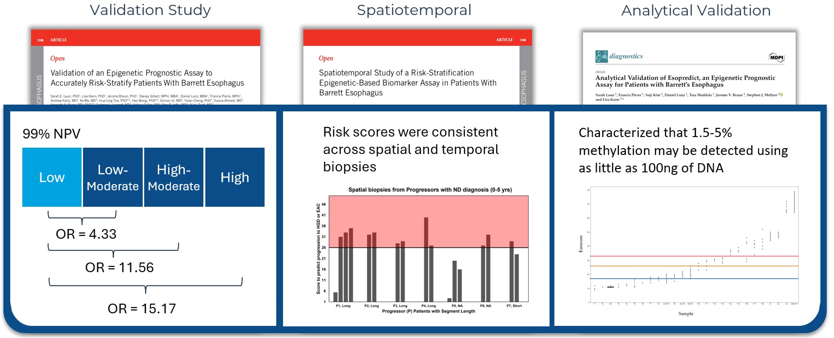 Esopredict test performance has been validated in three peer-reviewed publications. The data analyzed in those publications demonstrated a 99% negative predictive value (Laun SE, et al. Am J Gastroenterol. 2024.) and consistency across spatial and temporal biopsies (Laun SE, et al. Am J Gastroenterol. 2025.). Furthermore, the test was validated to show that 1.5 – 5% methylation may be detected using as little as 100ng of DNA (Laun SE, et al. Diagnostics (Basel). 2024.).