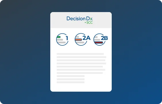 DecisionDx-SCC test result provides a genomic-based determination of your tumor’s likelihood to metastasize within the next three years. The test measures the activity of specific genes in your tumor, providing a result of low (Class 1), higher (Class 2A), or highest (Class 2B) biological risk of metastasis. DecisionDx-SCC provides you and your healthcare provider with an independent classification that is personal to your squamous cell skin cancer.