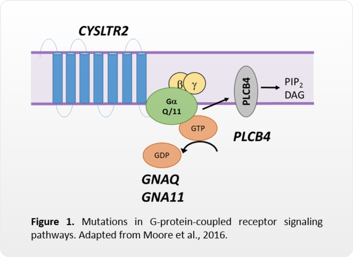 In UM, mutations in GNAQ, GNA11, CYSLTR2, or PLCB4 result in constitutive activation of G-protein-coupled receptor signaling pathways, such as MAPK, PI3K, PKC, Hippo, etc. (Van Raamsdonk, 2009; 2011; Johansson, 2016; Moore, 2016).