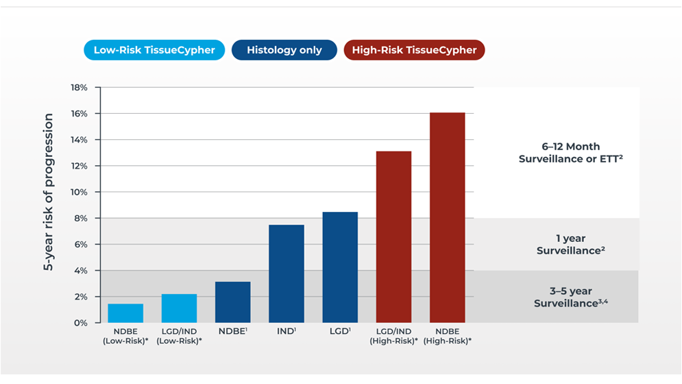 - Non-dysplastic BE + TissueCypher low risk: means those patients collectively have a 5-year risk of progression of 1.45%, providing confidence to follow guideline-based recommendations for 3-5 year surveillance. *
